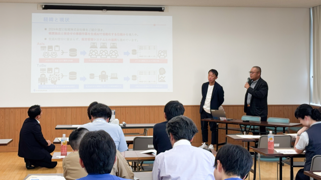 当日は、糸魚川市の企業様を中心に22社、24名の皆様にご参加いただきました。特に関心をお持ちいただいた内容は、帳票処理自動化AIについてです。この仕組みは、2024年からメビウスと連携して松尾株式会社様が導入を進めているもので、帳票の抽出や突合せといった事務作業を生成AIで自動化するものとなっています。今回は、業務効率化の好例として、松尾株式会社様にも登壇いただき、実際の導入プロセスやメリットについて紹介させていただきました。