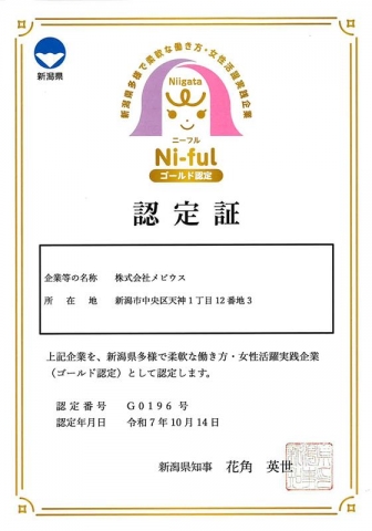 株式会社メビウス(本社:新潟県新潟市、代表取締役:加藤 幸久、以下「メビウス」)は、新潟県が令和7年10月より新たに創設した「新潟県多様で柔軟な働き方・女性活躍実践企業認定制度〈Ni-ful(ニーフル)〉」において、ゴールド認定(認定番号G0196)を取得しました。