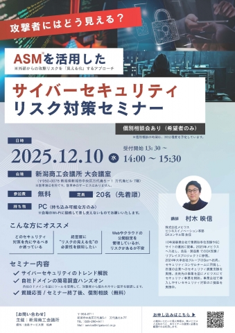 株式会社メビウス(本社:新潟県新潟市、代表取締役社長:加藤 幸久、以下「メビウス」)は、2025年12月10日(水)、新潟商工会議所で開催される「~攻撃者にはどう見える?~ASMを活用したサイバーセキュリティリスク対策セミナー」にて講師として登壇します。