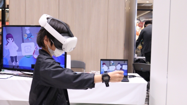メビウスからは、三菱重工環境・化学エンジニアリング株式会社様、新潟コンピュータ専門学校様と共同開発した「ごみ分別XRゲーム」を展示しました。XR技術を活用したこのゲームは、参加者が現実空間に投影されたバーチャルコンテンツを操作しながら、ごみ分別の重要性を体験的に学べる内容となっています。子どもから大人まで幅広い世代の皆様に体験いただき、ごみ分別の仕組みや環境への影響について楽しみながら学ぶ姿が見られました。